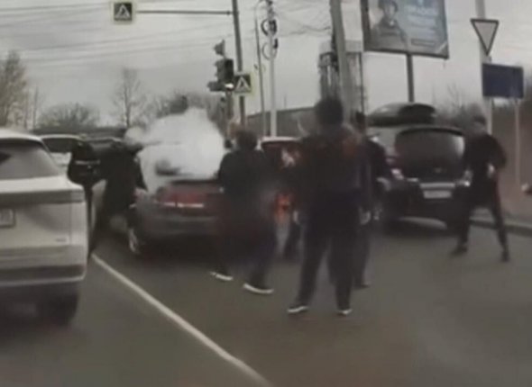 Запись была сделана на перекрестке в районе Узловой, когда автомобили стояли на "красном". На кадрах видно, как машина без номеров начала подпирать впереди стоящий автомобиль в соседней полосе. Рядом остановилась ещё одна машина, из которой выбежали несколько мужчин. Они окружили чужую машину и разбили передние стекла. Тогда уже из этого авто выбежали другие люди — они напали на оппонентов, а один из них даже выстрелил в них.
