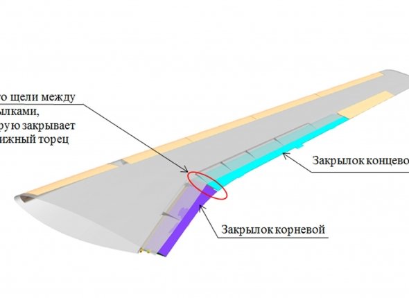 В ПАО "Яковлев" был разработан подвижный торец закрылка. В крейсерском полете он заполняет щель и убирается при выпуске закрылков без дополнительных силовых приводов.