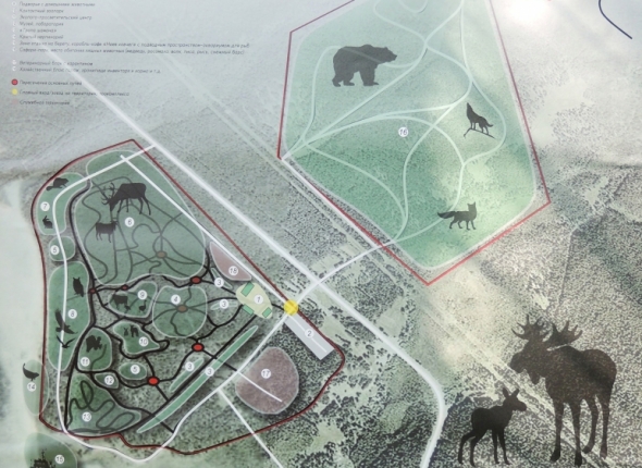 Парк расположится по обе стороны Байкальского тракта: рекреационная зона с "тропой шамана" — со стороны водохранилища, а через дорогу — сафари-парк площадью 96 га. Там будут размещаться сибирские животные.