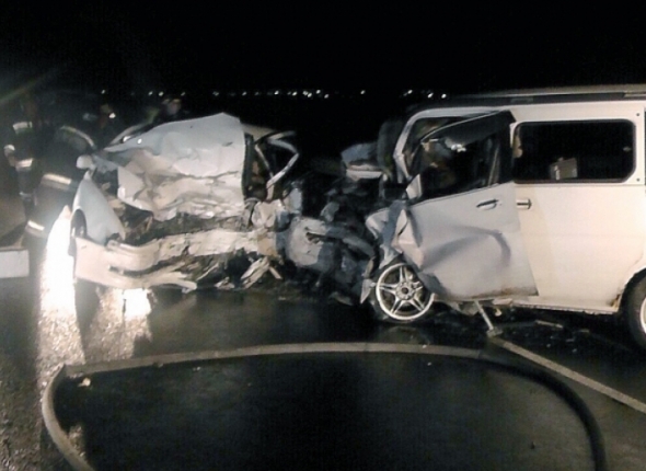 "В результате дорожной аварии погибли на месте водитель и двое пассажиров Toyota и пассажирка Honda. Водитель минивэна в тяжелом состоянии госпитализирован.